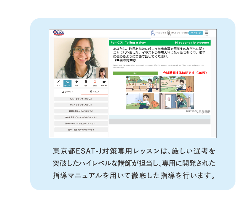 中学生を標準導入(デフォルト)にした大きな理由は、都立高校入試でスピーキングテスト(ESAT-J)が導入されたことです。特に9月から11月にかけては、通常のカリキュラムからESAT-J対策モードに切り替えて運用を行っています。 スピーキングテスト特有の「4コマ漫画を見て状況を説明する」問題や「自身の意見を述べる」問題は、生徒が独りだけで対策するのは非常に困難です。オンライン英会話を活用することで、実践形式で傾向を掴むことができ、試験本番の緊張感を和らげることができました。実際、受験後のアンケートでは半数の生徒が「手応えがあった」と回答しており、回答の時間感覚や構成力が身についたと実感しています。保護者の方に対しても、学校の授業進度との連動や入試優遇のメリットを伝えることで、スピーキング対策の必要性を深く理解していただけています。