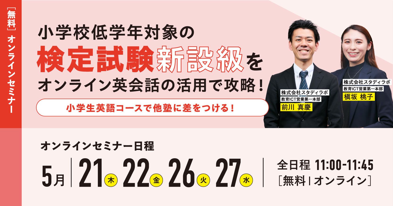本セミナーでは、小学生英語、とくに低学年からの英語コース導入が塾経営において重要となる理由を整理したうえで、オンライン英会話を活用した「4技能型カリキュラム」の構築方法と、集客・定着につなげる運用のポイントをご紹介します。また、英検など外部検定対策を軸にした商品設計や、英語コースのブランディング強化に向けた考え方についても解説します。